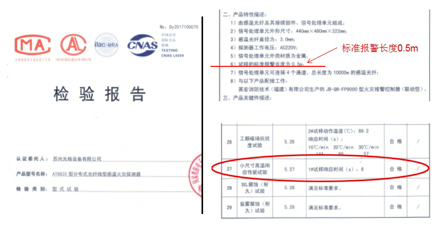 近日,蘇州光格設備有限公司研發(fā)生產(chǎn)的高分辨率線(xiàn)型光纖感溫火災探測器AT882X通過(guò)了國家消防電子產(chǎn)品質(zhì)量監督檢驗中心型式檢驗,其中令人矚目的是,本次送檢產(chǎn)品標準報警長(cháng)度為0.5米,除了國標規定的差定溫等一系列檢驗項目,還通過(guò)了“小尺寸高溫響應性能試驗”,這表明AT882X線(xiàn)型光纖感溫火災探測器產(chǎn)品,已能夠把DTS、感溫電纜、光纖光柵等綜合優(yōu)勢融為一體,給客戶(hù)重要資產(chǎn)防災安全帶來(lái)更加可靠、便捷、經(jīng)濟的解決方案。