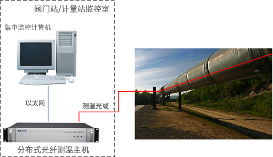光格油氣管道泄漏監測系統由分布式光纖測溫主機及相應的測溫光纜組成,對管道的溫度進(jìn)行連續線(xiàn)型實(shí)時(shí)在線(xiàn)監測,從而監測管道泄漏情況。整套監測系統通過(guò)其測溫控制主機通訊接口或干接點(diǎn)繼電器端子與管道SCADA系統相連,并負責向其提供報警信息及運行和故障信號。