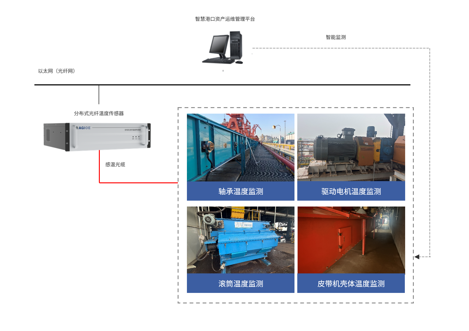糧食碼頭作業(yè)中,皮帶機軸承摩擦、糧食堆積發(fā)熱等隱患易引發(fā)火災,直接威脅作業(yè)安全。傳統點(diǎn)式測溫手段存在成本高、維護難度大等痛點(diǎn)。光格科技采用分布式光纖傳感技術(shù),實(shí)現皮帶機全線(xiàn)溫度連續實(shí)時(shí)監測,結合智能算法精準識別并定位溫度異常,提前預警火災風(fēng)險,全面提升糧食碼頭安全管理水平與智能運維能力。