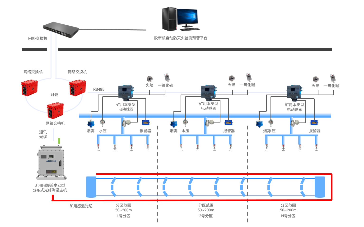 系統基于分布式光纖溫度傳感技術(shù),在膠帶機沿線(xiàn)敷設感溫光纜,實(shí)現對膠帶機全線(xiàn)區域的連續溫度監測與實(shí)時(shí)火災隱患識別。通過(guò)融合火焰探測器、二氧化碳傳感器及煙霧傳感器等多類(lèi)型感知終端,系統利用多源信息融合算法,對溫升趨勢、煙霧濃度及氣體特征進(jìn)行綜合判定,從而實(shí)現火情的早期識別。